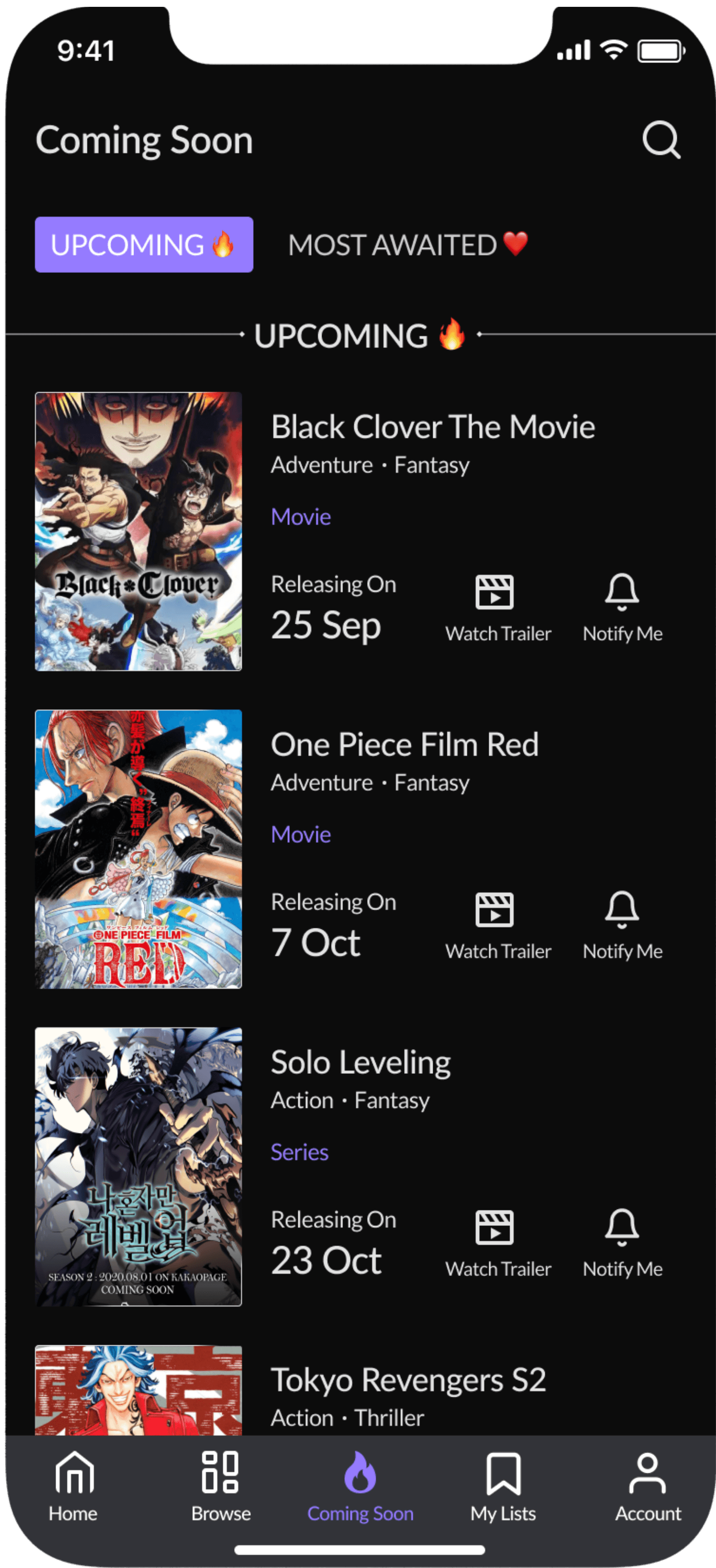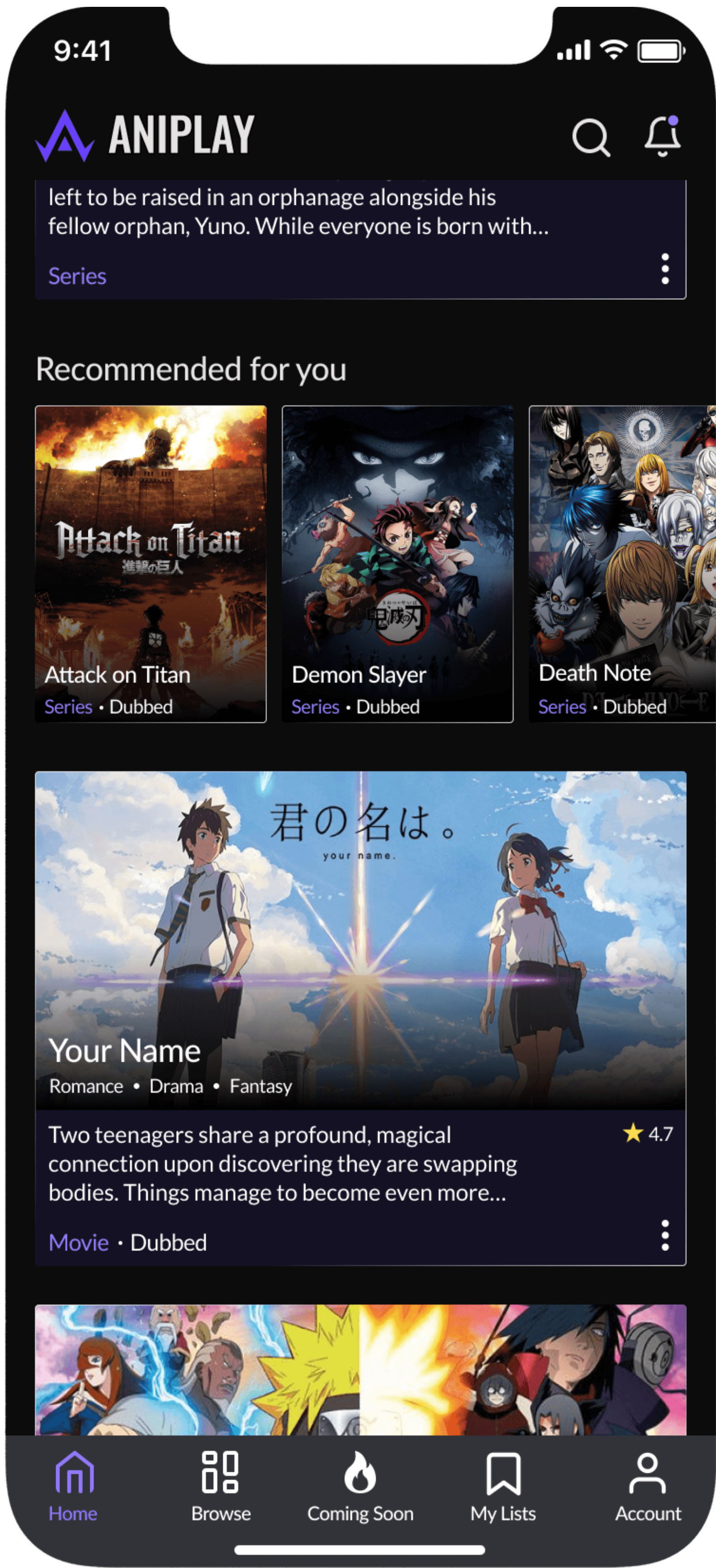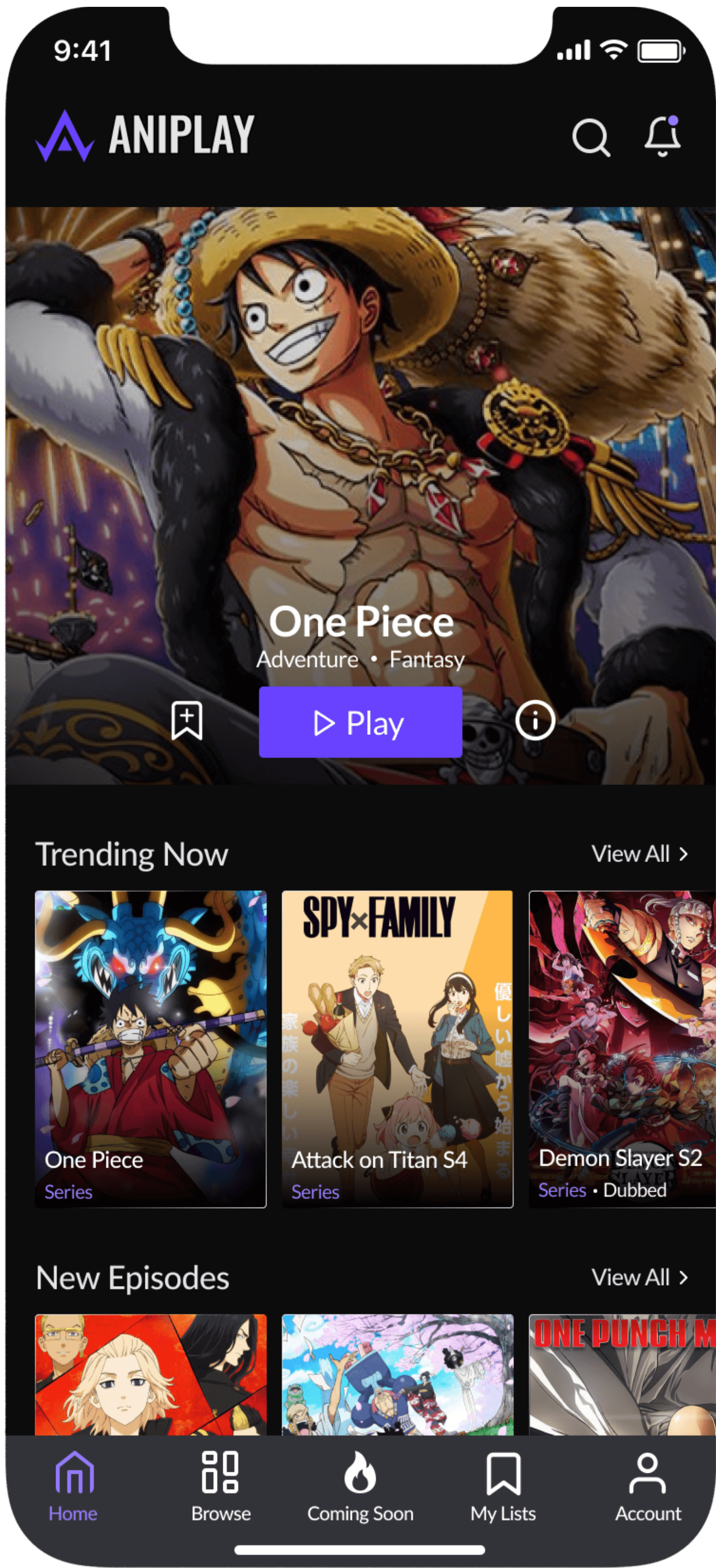Homepage includes notifications, trending, new episodes and dedicated anime cards which indicate must watch shows