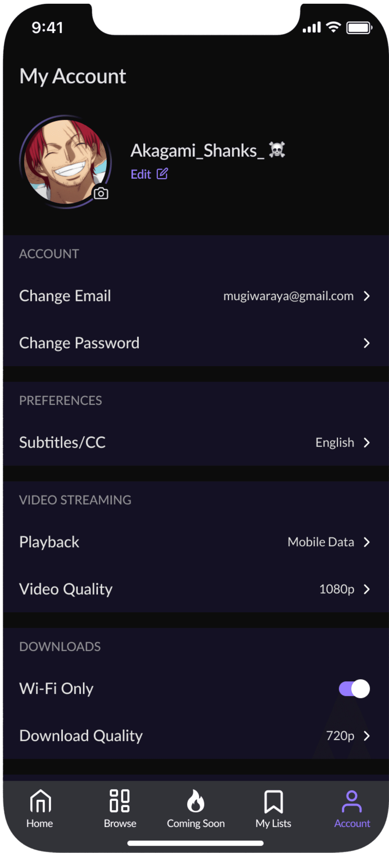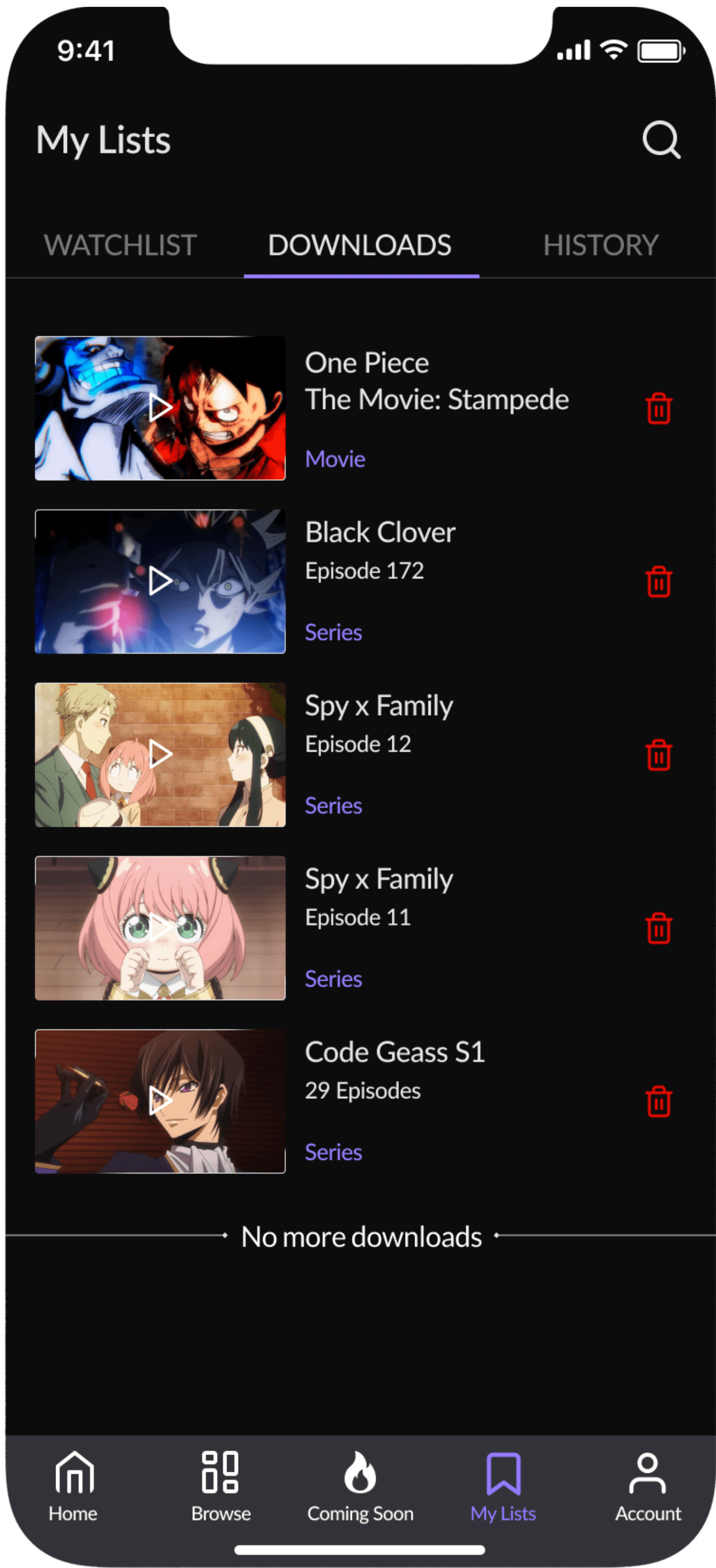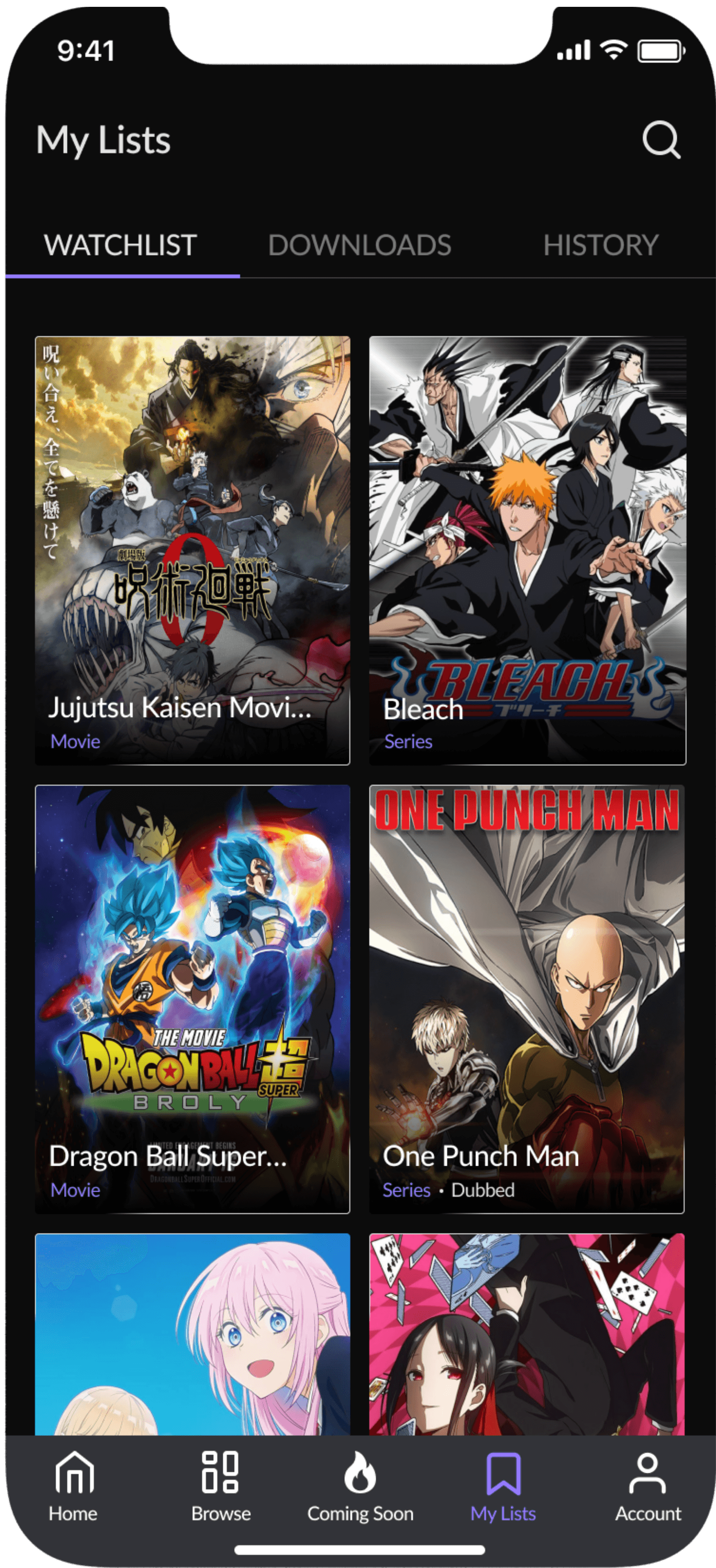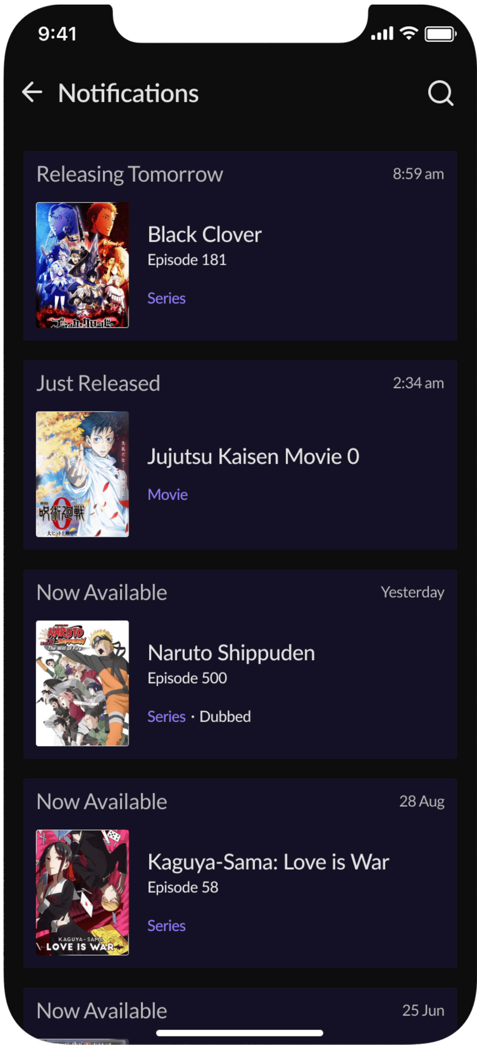 Homepage includes notifications, trending, new episodes and dedicated anime cards which indicate must watch shows