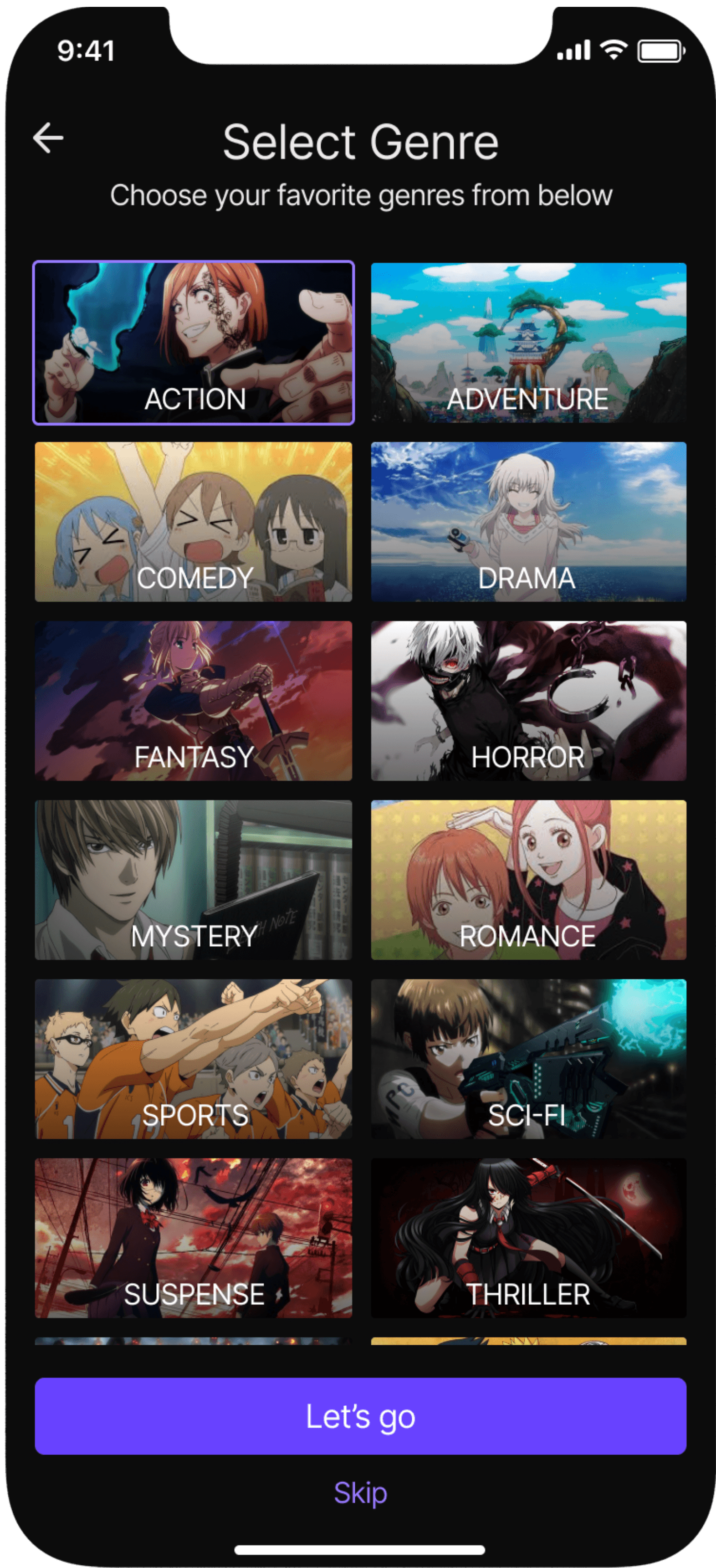 Users can select their favorite genres beforehand which will help in recommending anime to them. They can skip this page if they want to.