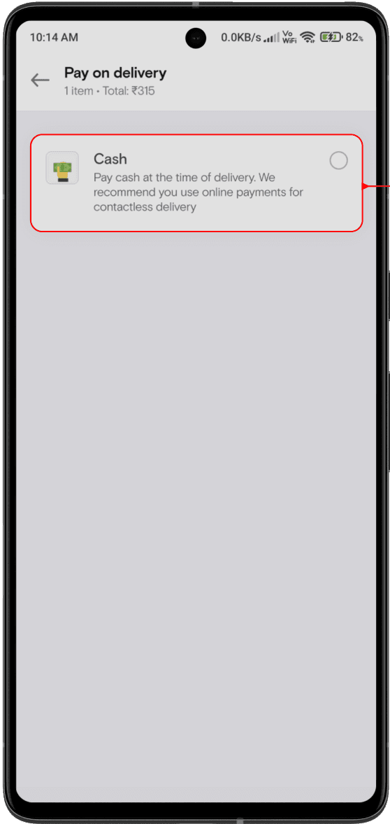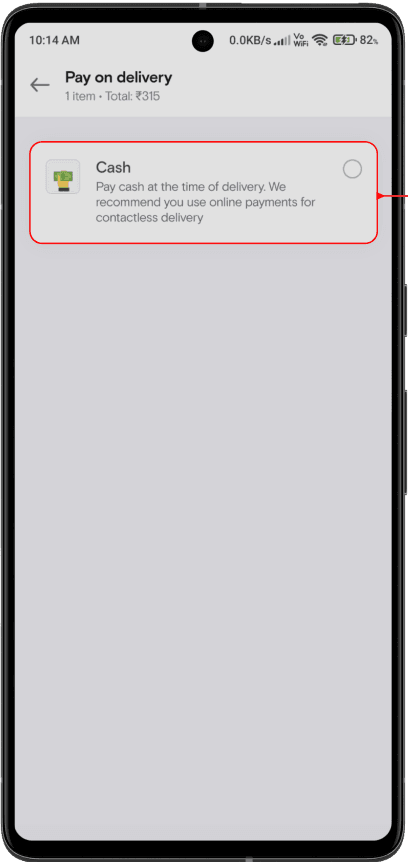 Pay cash at the time of delivery. We recommend you use online payments for contactless delivery.