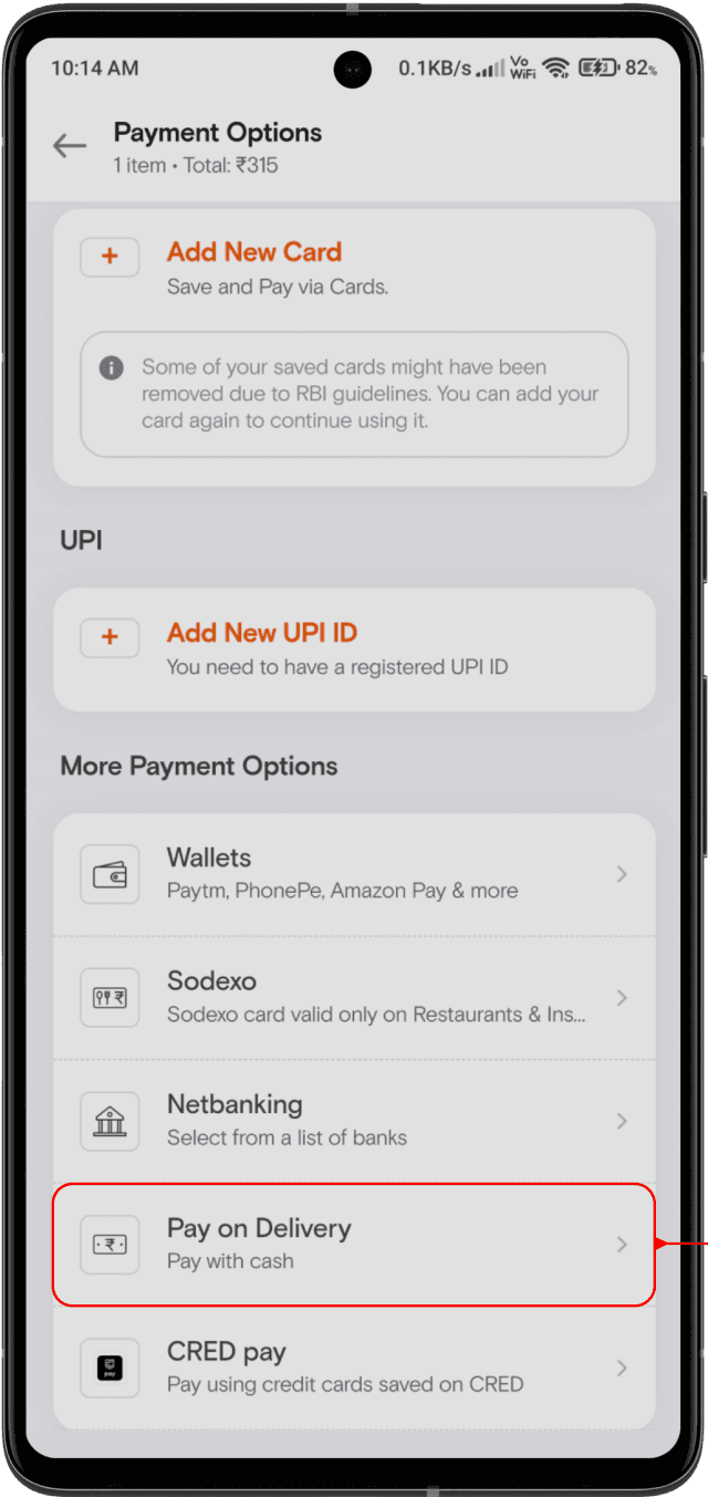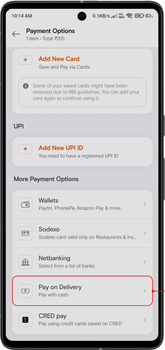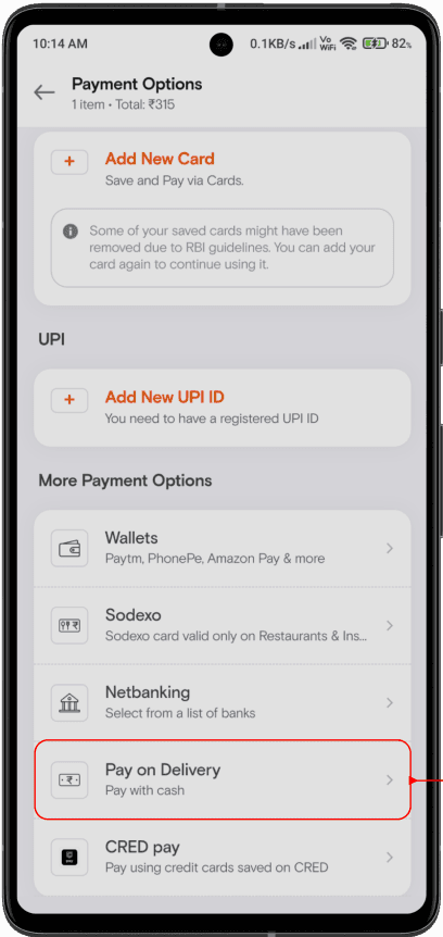 However, according to my research, COD is a dominant payment mode on Swiggy. Hence this solution is not much reliable as it doesn’t get exposure as compared to online payment option and also it has a drop-down mechanism which breaks the design consistency.