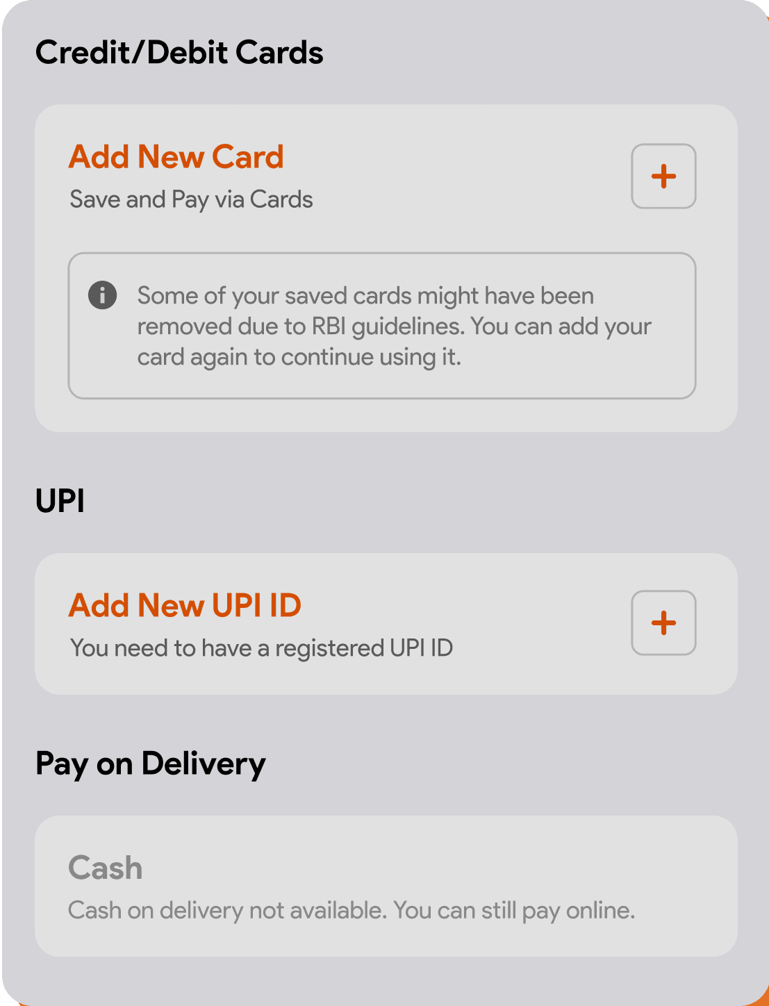 Some of your saved cards might have been removed due to RBI guidelines. You can add your card again to continue using it.